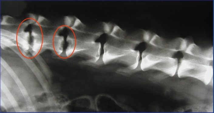 If a typical lesion is detected, radiographs of the entire spine are recommended because some pets have multiple lesions. Infection causes disc degeneration and destroys the ends of the adjacent vertebrae. These degenerative changes may weaken the vertebral column and make it susceptible to pathologic fractures, which stem from infection rather than trauma. The body may try to bridge the damaged area with bone, which can encroach on the spinal cord and nerve roots, causing more problems.
